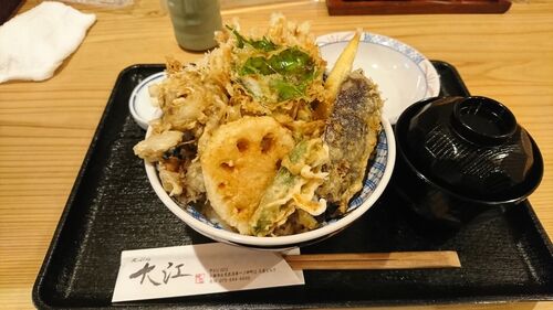 伏見稲荷の参道近くにある天ぷら屋 大江に訪問。 自分が食べたのは野菜天丼だけど、彼女がざる蕎麦(天ぷら5種盛り)を 食べてたのでちょっと貰った。 野菜天丼が1200円、ざる蕎麦(天ぷら5種盛り)が1500円。 久々の当たりの店だった。 安いのでネタの質が…